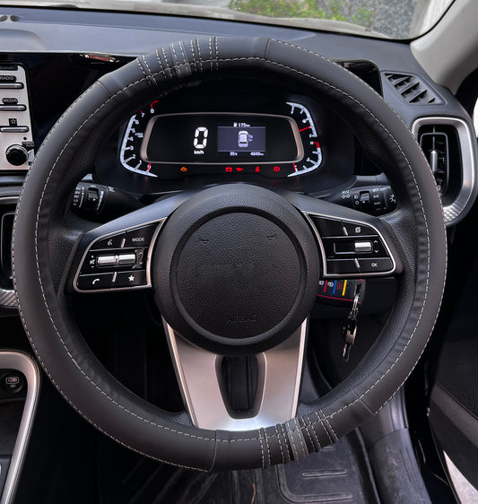 Oshotto Artifical Leather SC-13 Car Steering Cover for All Cars (Black with White Thread)