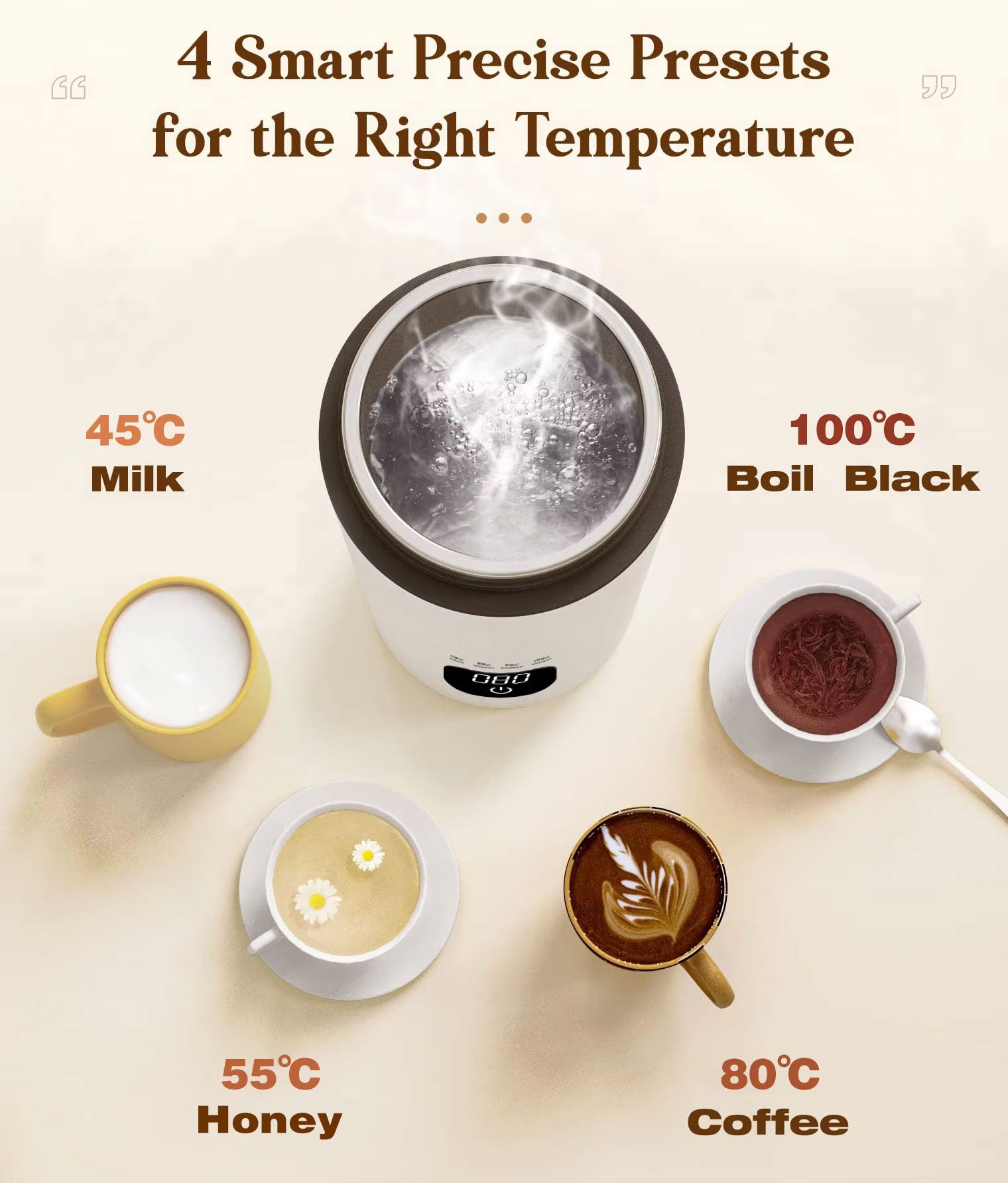 - MULTI-FUNCTIONAL USE: This travel electric kettle offers 6-in-1 functionality with 6 temperature presets for boiling water, making yogurt, heating milk, stewing, brewing tea, and keeping warm; easily adjust temperatures using the high-definition LCD screen