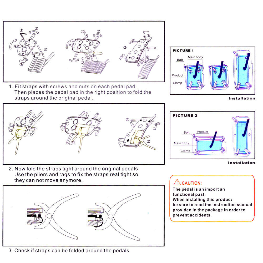 If the pedals still loose after installation, please check and install again. If the pedals tangle with the mat or the sidewall, they will not work well and even bounce back. At that time, you should loosen screws to remove pedals. Between the pedals and sidewall, keep no less than 5 mm space, so that the pedals can work freely and it can avoid dangers. Please check your pedal size before buying.