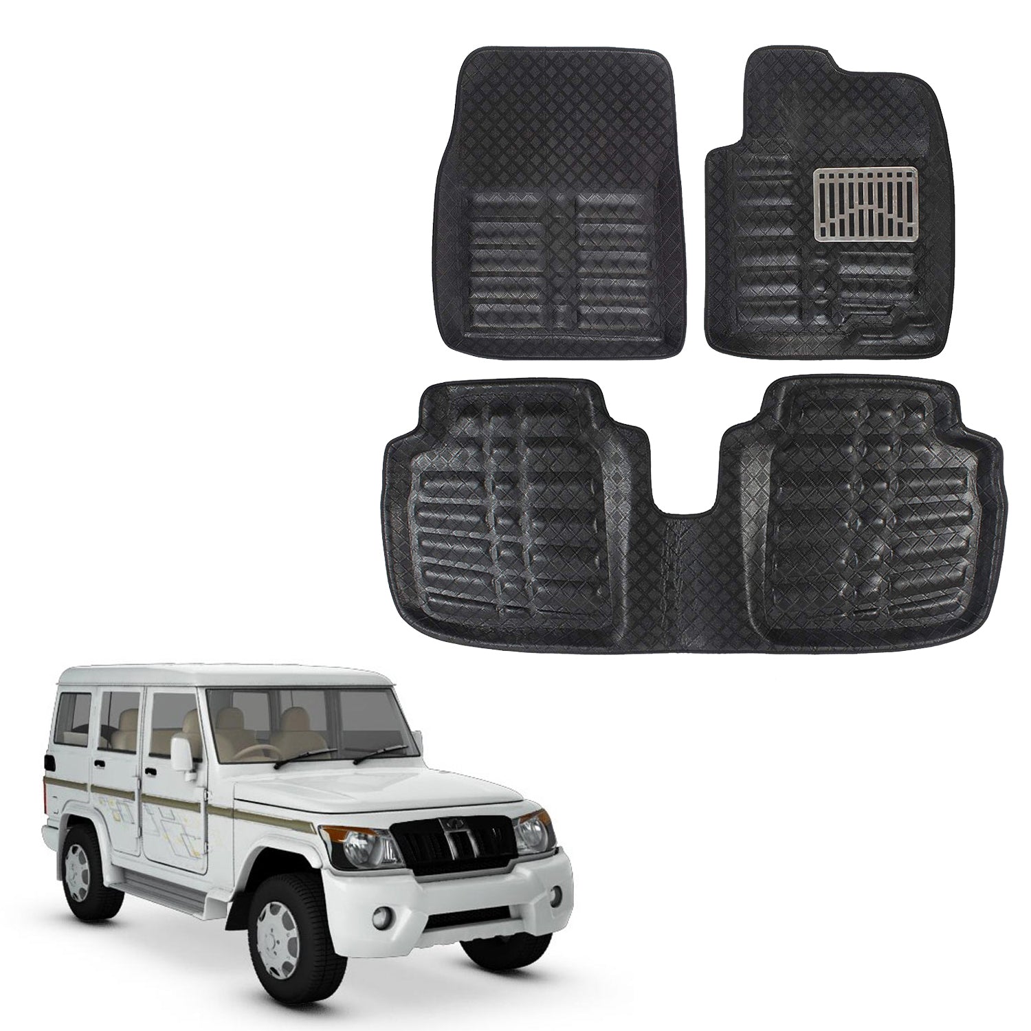 Oshotto 4D Artificial Leather Car Floor Mats For Mahindra Bolero - Set of 4 (Complete Mat with Third Row) - Black