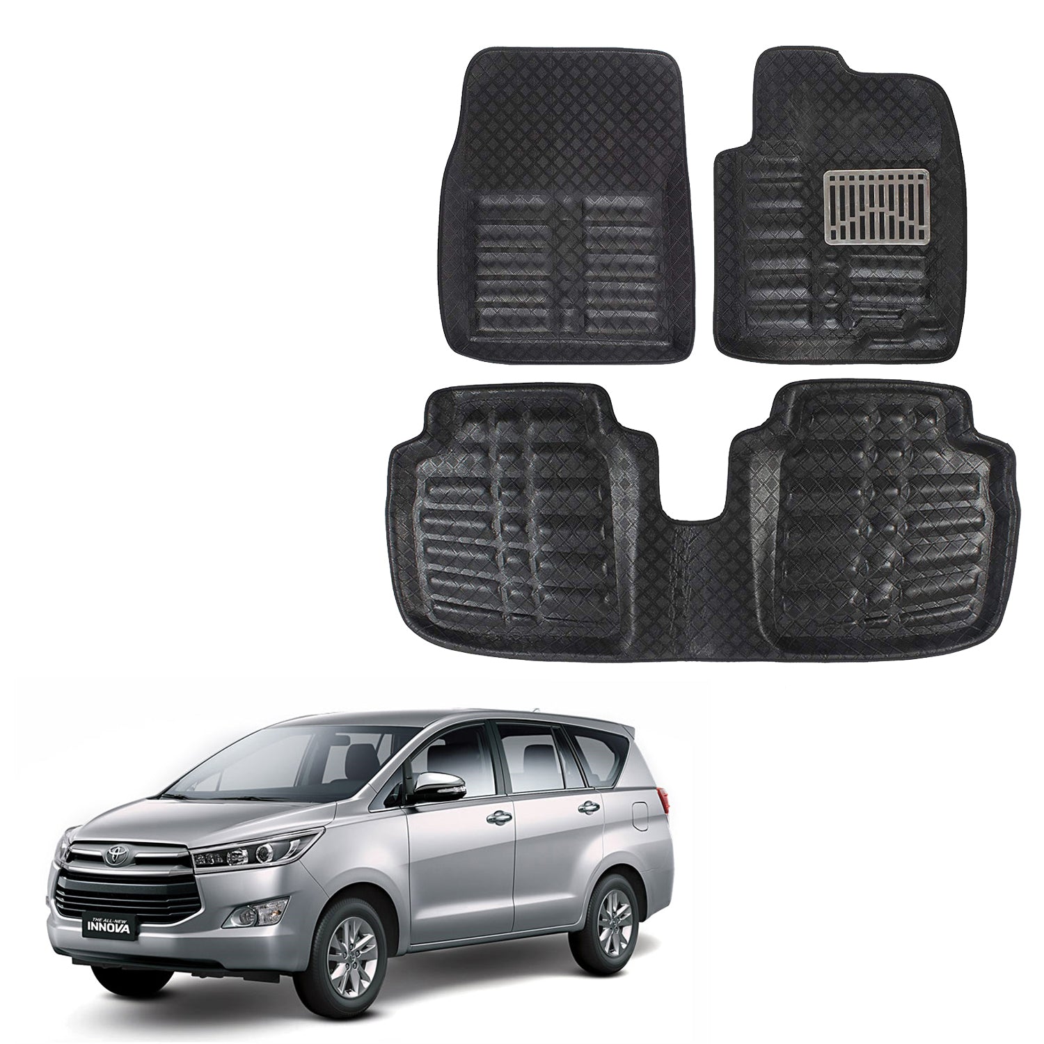 Oshotto 4D Artificial Leather Car Floor Mats For Toyota Innova - Set of 5 (Complete Mat with 3rd Row and Dicky) - Black