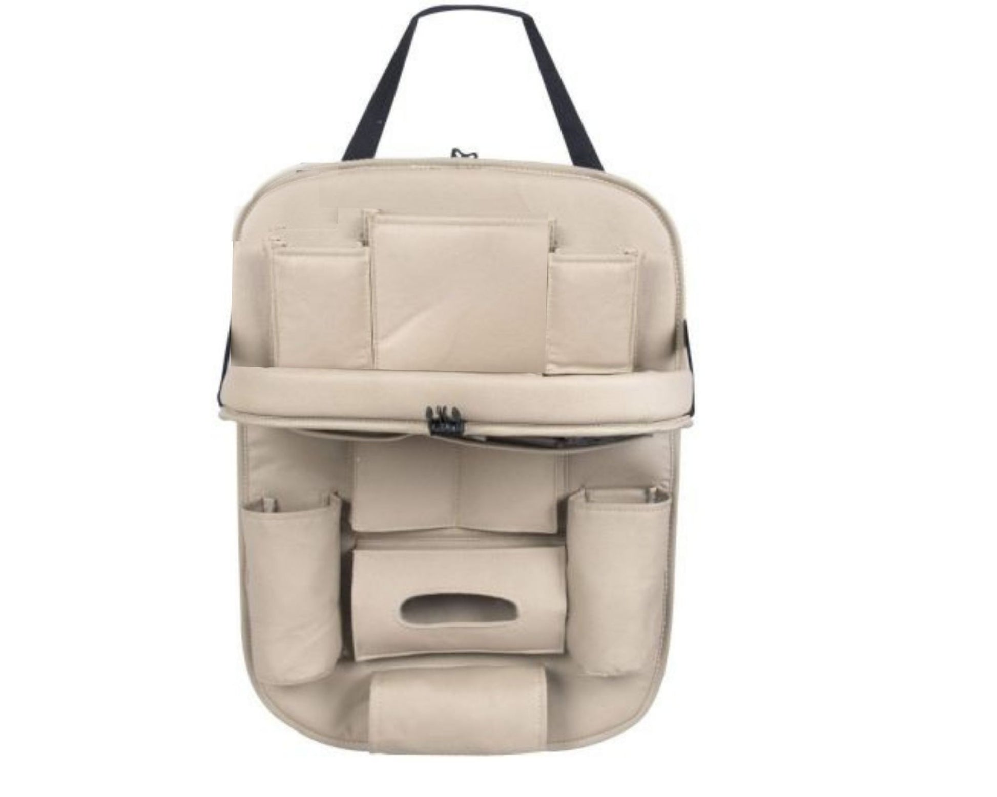 Oshotto Car Backseat Storage Organizer with Foldable Tray, Multi-Pocket for Bottles, Tissue Boxes Compatible with All Cars (Beige)