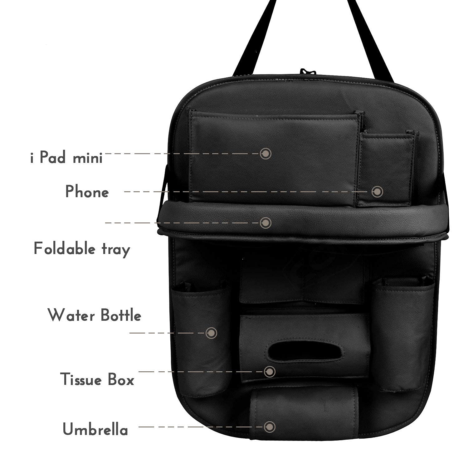 - MULTI-POCKET /CONVENIENT ORGANIZATION –: Car Back Seat Organizer with Tray,10 Separate different size compartments provide quick access to iPad, phones, bottles, umbrella, papers, magazines, and more.This auto organizer keeps your car organized, and will protect your seat from getting scratched.