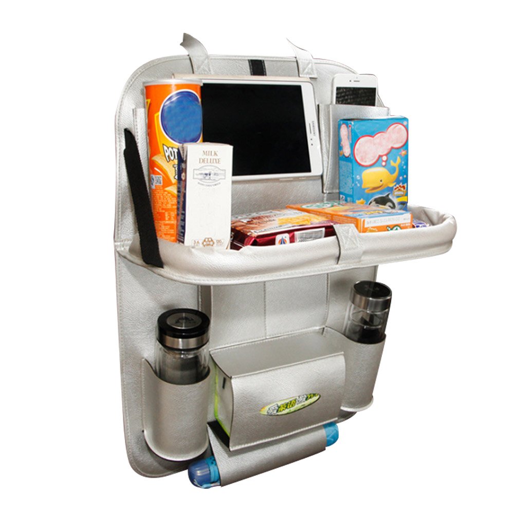 - STURDY FOLDABLE TRAY & ADJUSTABLE –: Car Organizer Accessories with Tray, Made of hardboard, bear up to 2kg items, take your eating on the go more convenient and safe. The Backseat Organizer will stay in place it won’t slide off your car seat