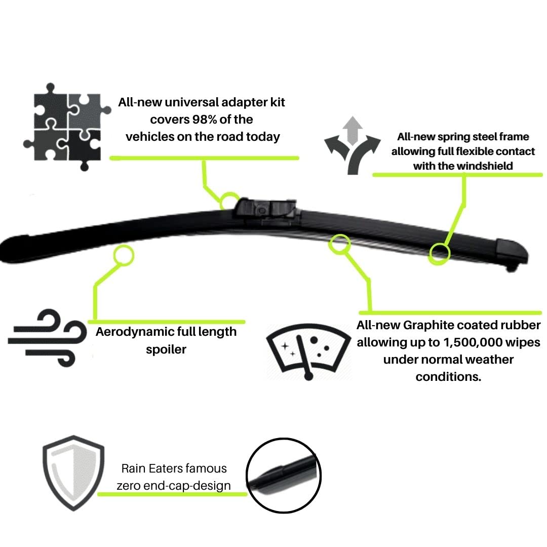 These wiper blades are equipped with graphite coating to ensure smoother wiping and this comes with a pre-mounted quick-clip adapter for ease of installation. Aerodynamic design for smooth and quiet operation revolutionary frameless wiper blades with improved design and performance over conventional blades this frameless wiper blade technology is the new generation design adopted by top car manufacturers integrated flexible steel frame spine secures the rubber blade in a seamless structure large coverage for Indian market.