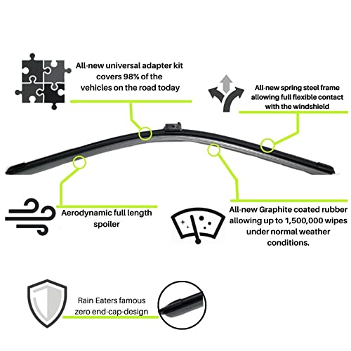 These wiper blades are equipped with graphite coating to ensure smoother wiping and this comes with a pre-mounted quick-clip adapter for ease of installation. Aerodynamic design for smooth and quiet operation revolutionary frameless wiper blades with improved design and performance over conventional blades this frameless wiper blade technology is the new generation design adopted by top car manufacturers integrated flexible steel frame spine secures the rubber blade in a seamless structure large coverage for Indian market.