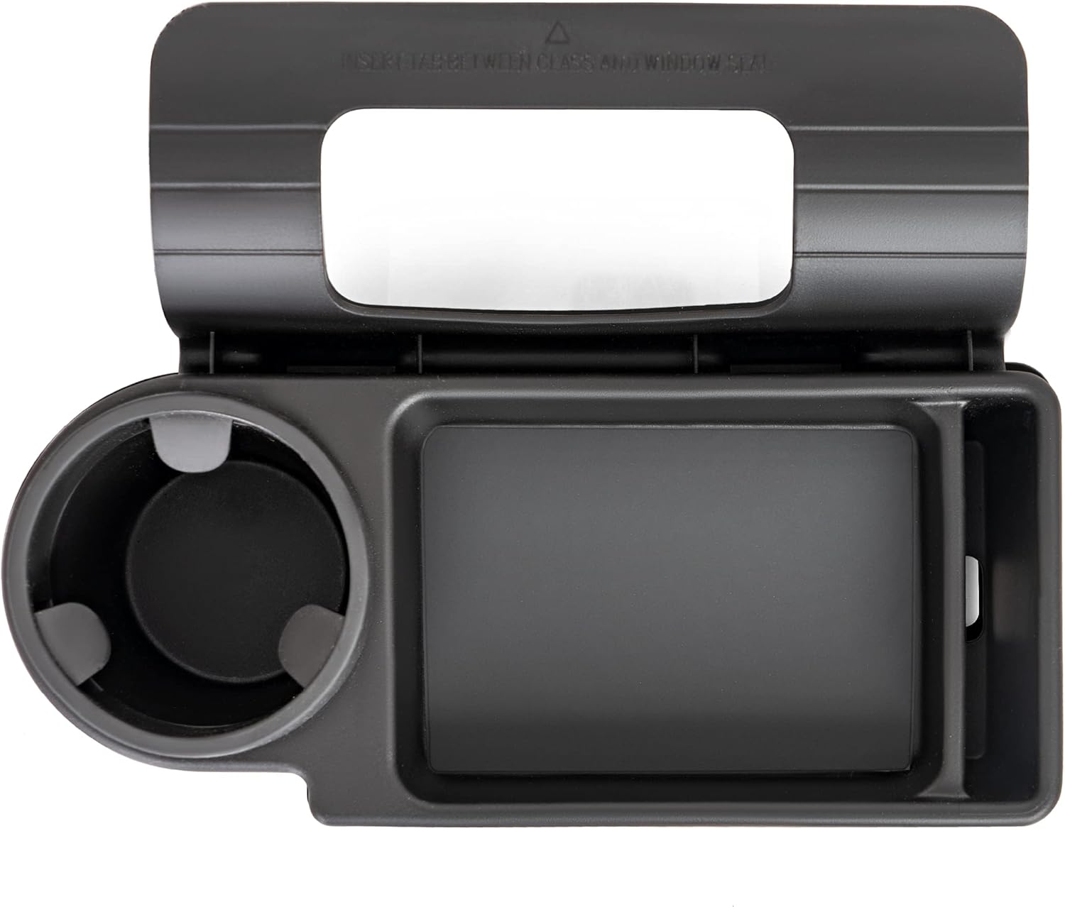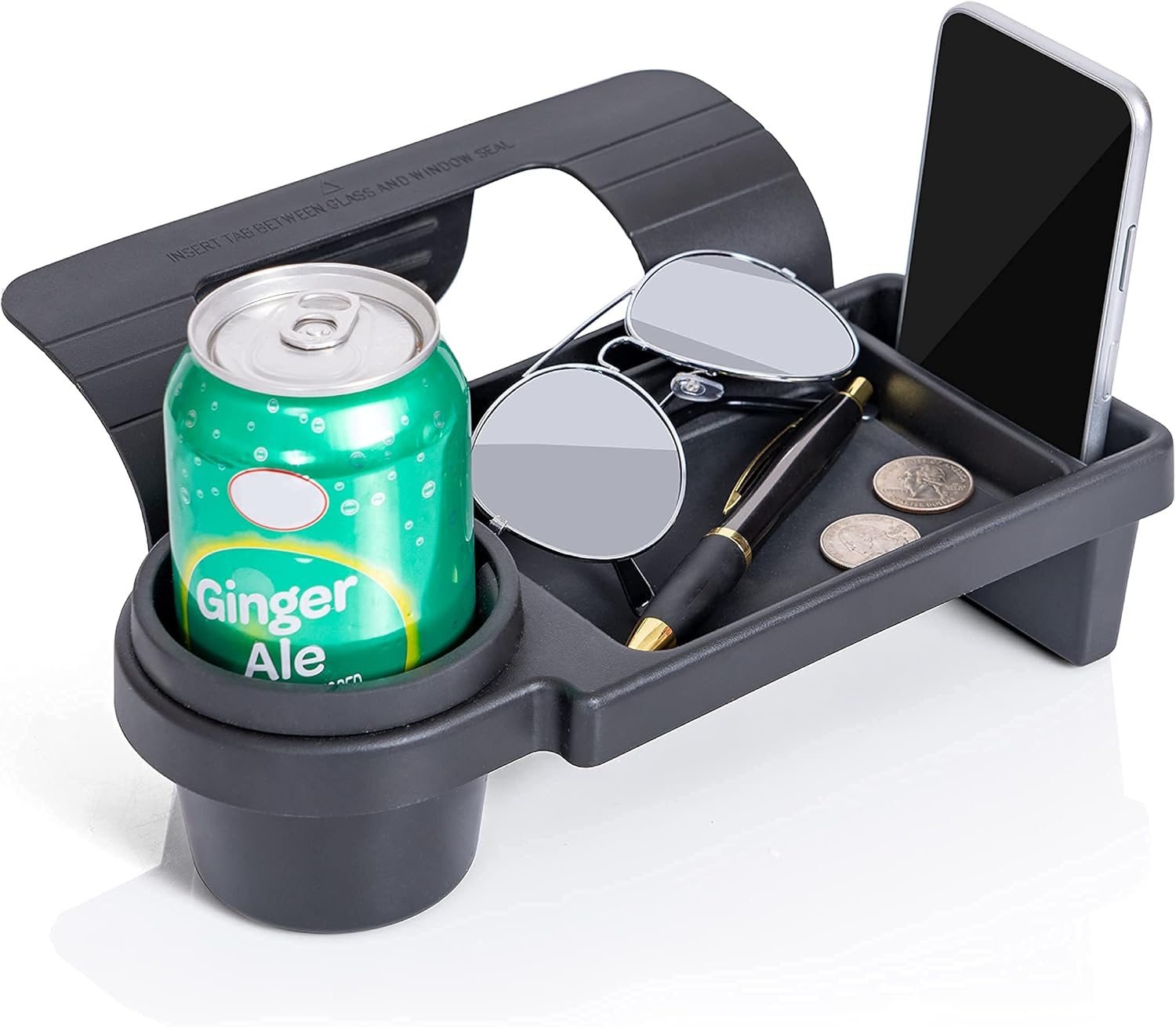 Keep personal belongings close by and easy to reach with this 3 in 1 window mount car tray that includes a cup holder for car, a phone holder, and a miniature tray to store your wallet, cash, cards, valuables, and other small items. Can also be used in the backseat for your baby bottle or kids snack tray. The window mounting design has a plastic lip that slides between window and car door panel for a secure fit. Includes foam pads for added stability if needed. Made from a single piece of ABS molded plastic for maximum strength and durability....
