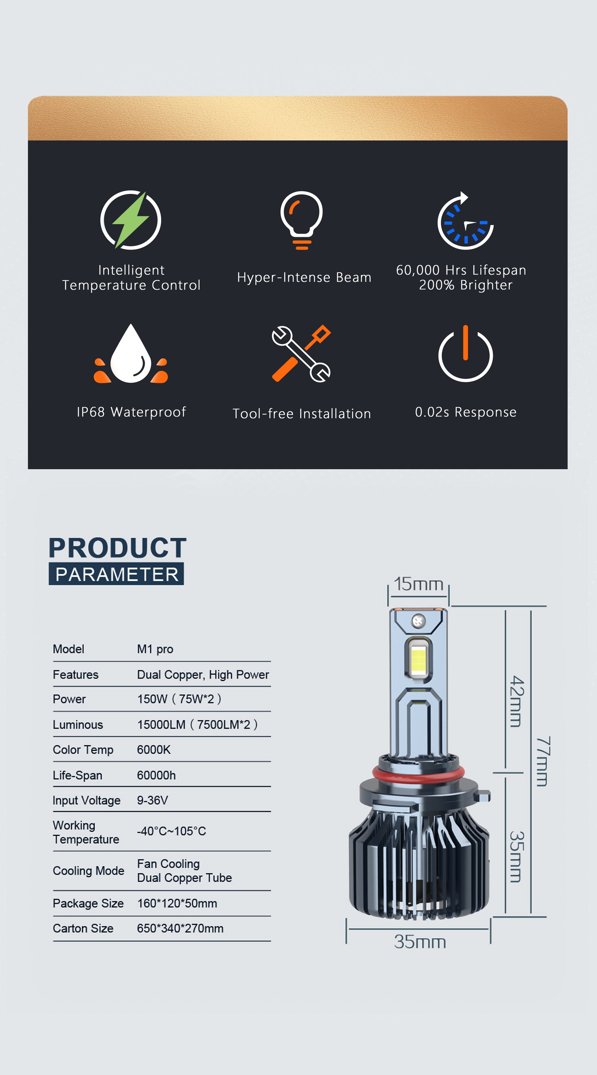 - High Power 150W: Ultra-bright, 150W LED output for maximum brightness, providing clear visibility for safer nighttime driving.