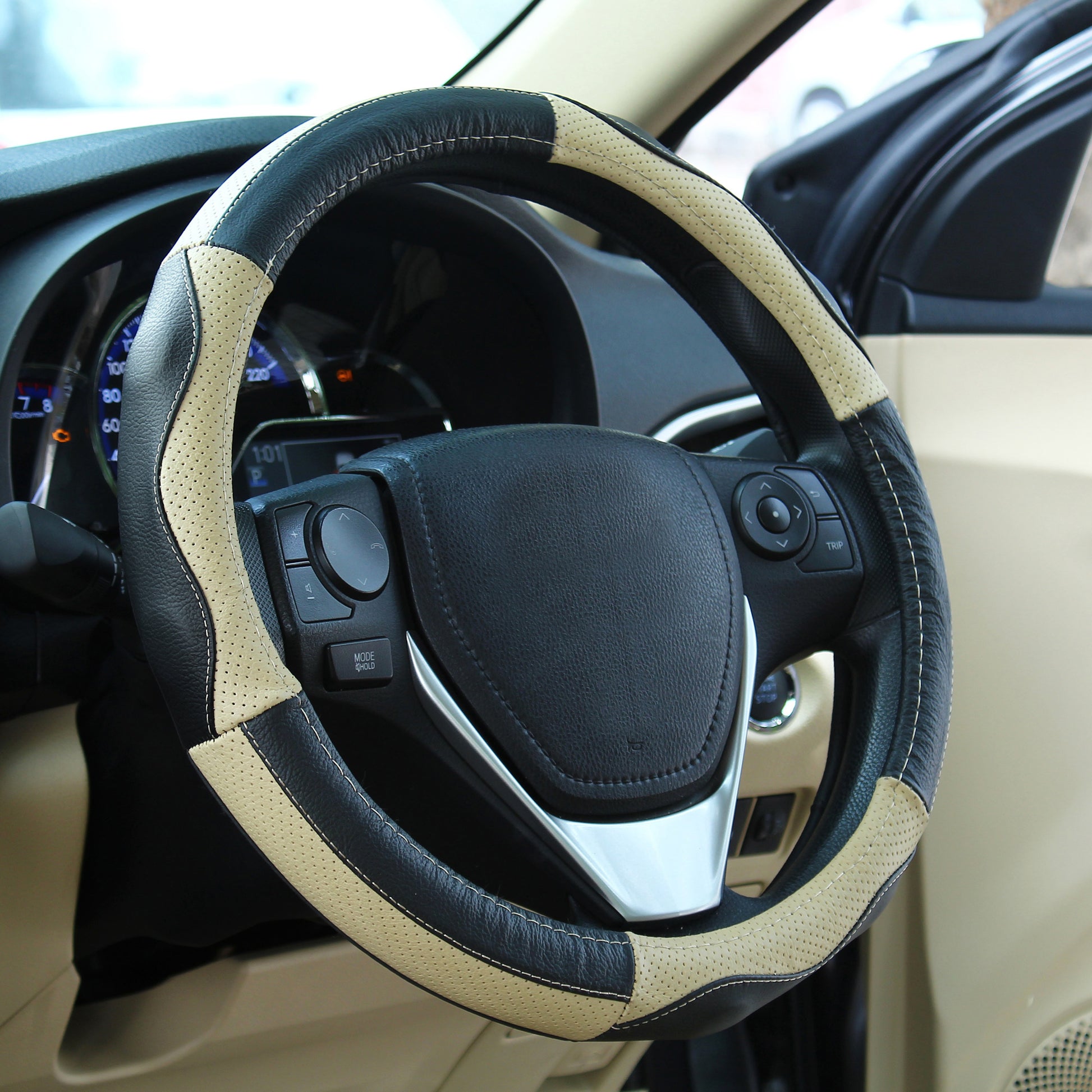 Oshotto SC-008 Leather Car Steering Cover (Black and Beige,Medium)
